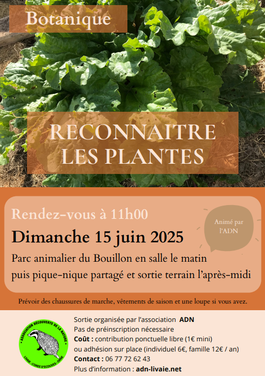 La prochaine sortie de l’ADN aura lieu dimanche 15 juin 2025 sur le thème de la botanique. « Reconn