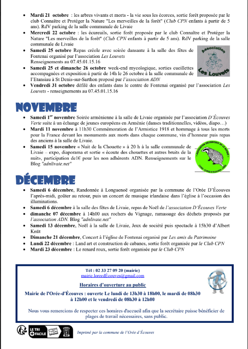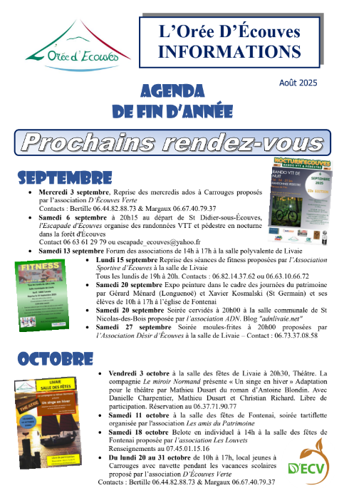 Pour info, voici l’agenda des prochains rendez-vous de L’Orée d’Ecouves pour la fin de l’année.