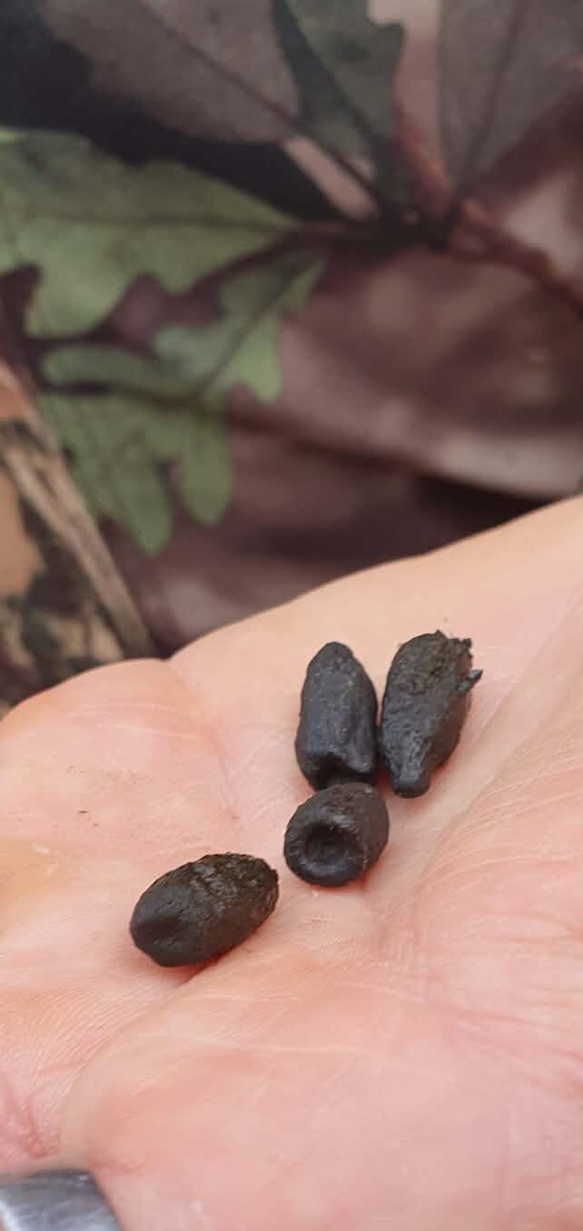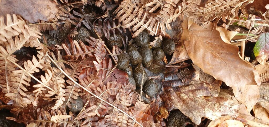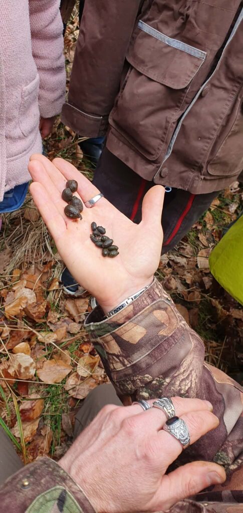 Crottes de la biche (les plus grosses ovales avec une légère petite pointe ) et celles du chevreuil ( plus petites).