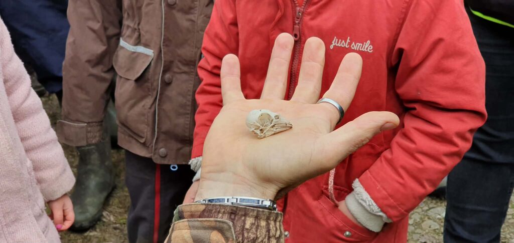 Stéphane Bouet, notre guide du jour a commencé par la présentation de divers indices pouvant indiquer des présences dans la nature. Ici le crâne d’un oiseau, mais il a aussi présenté entre autre des bois de cerf…