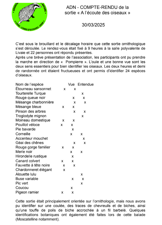 Compte-rendu de la sortie oiseaux du dimanche 30 mars 2025.